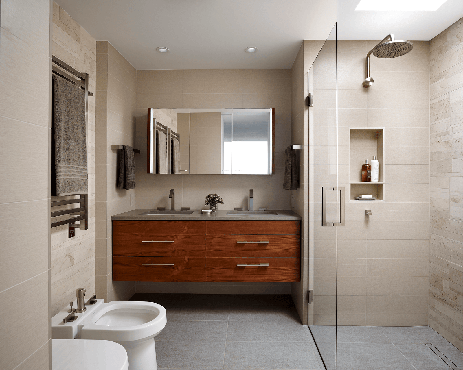 In the primary bath, a wall-mounted double vanity, a large curbless shower, towel warmers, and both a bidet and toilet are arranged within the compact footprint. A natural limestone accent wall tile and satin nickel fixtures add sophistication while the custom shower wall niche provides convenient storage. The hall bath shares a similar aesthetic. A cool palette juxtaposes gray walls and white counters with embedded mirror chips for subtle sparkle. Heated tile floors and engineered stone vanities lend comfort and durability to both baths.