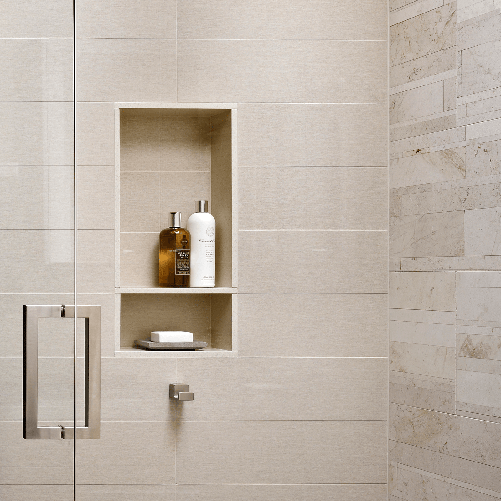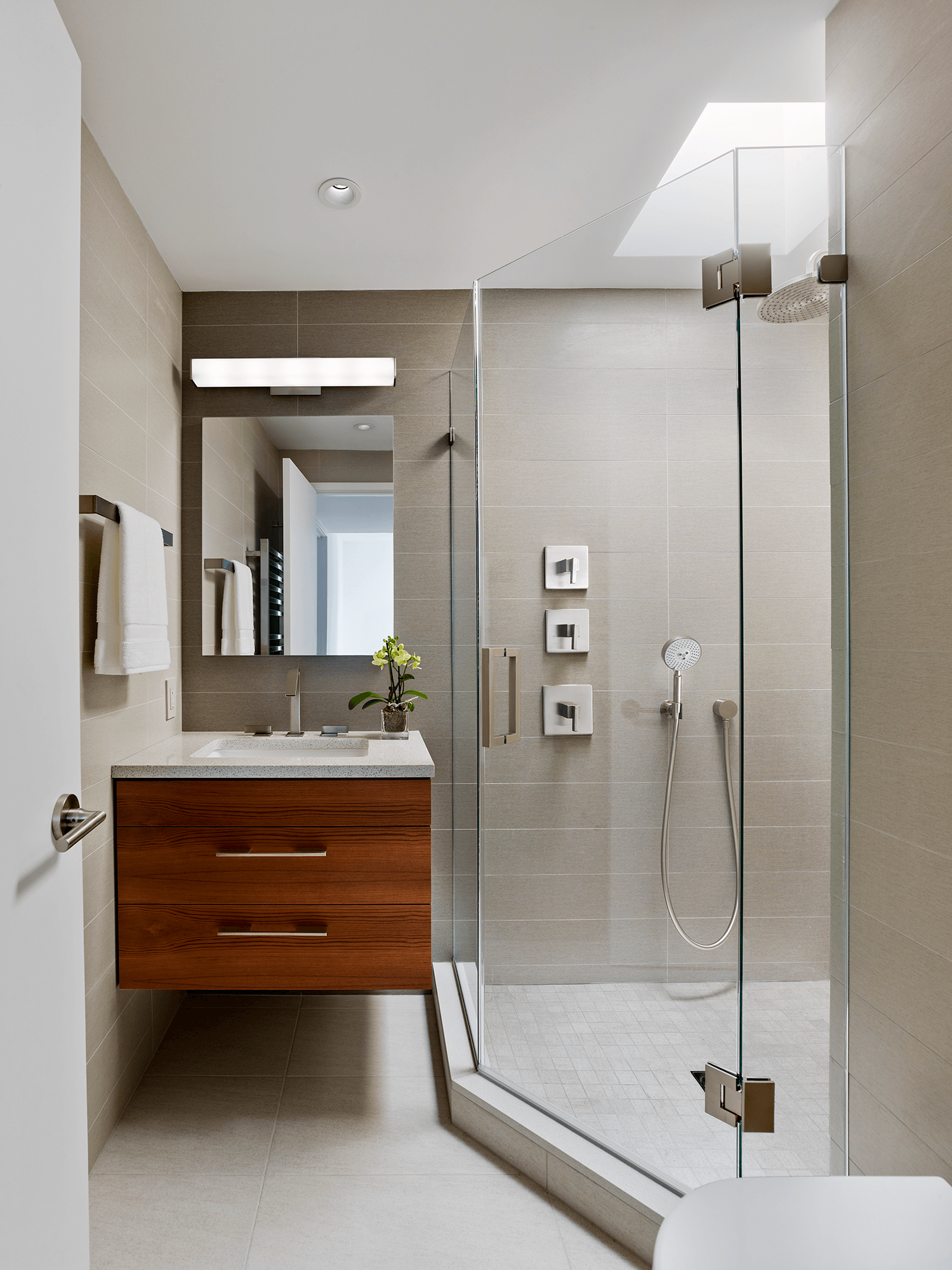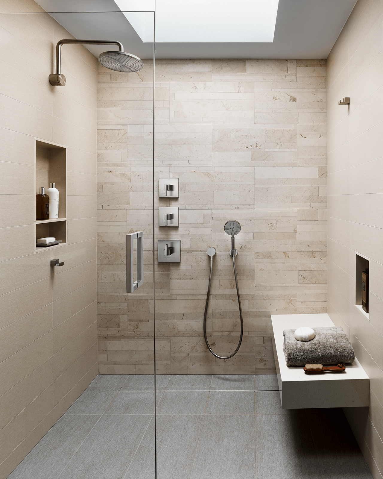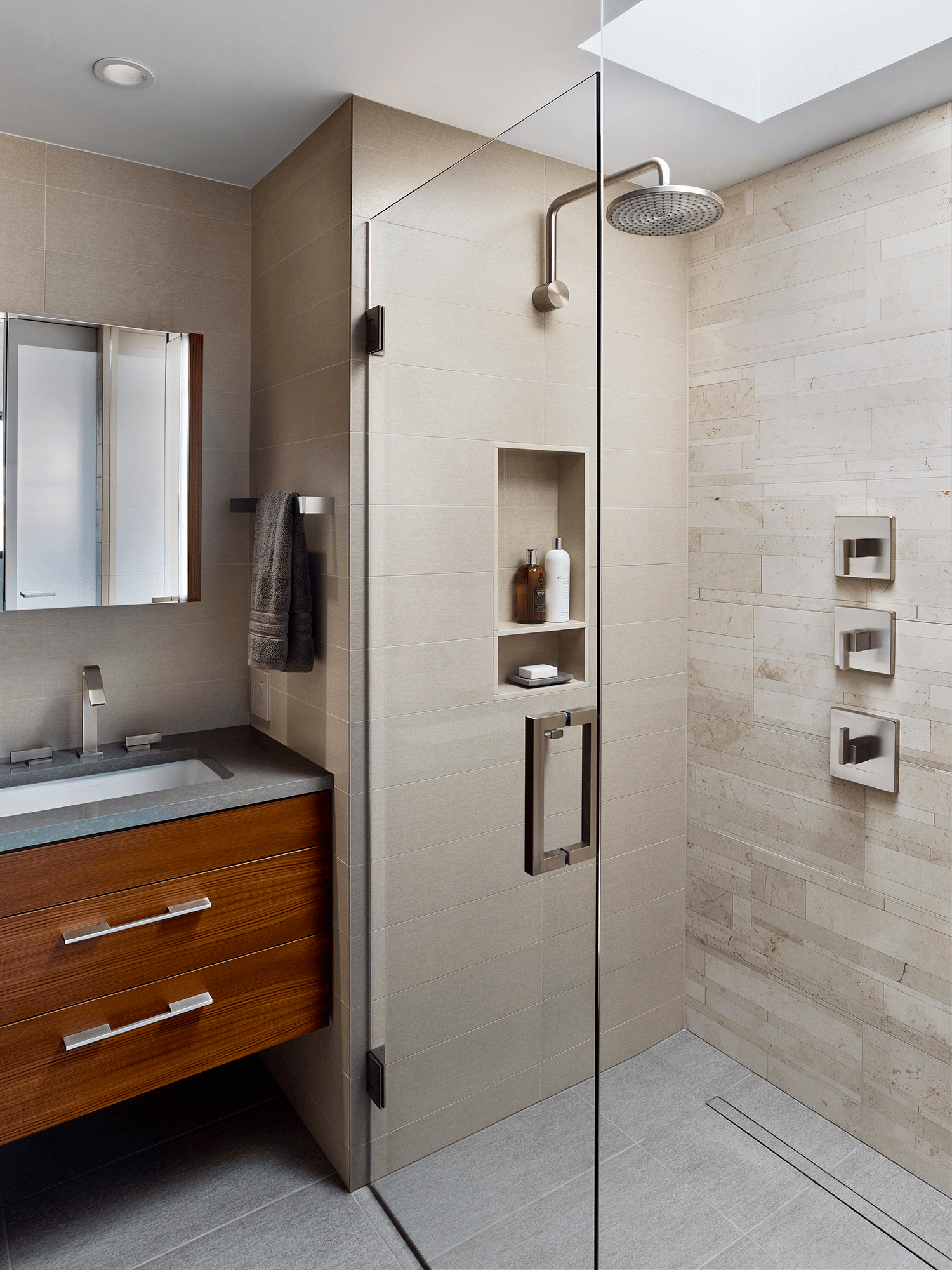 kYd designed a complete renovation of the primary and hall baths within a Philadelphia condominium. Taking inspiration from the stone of the iconic Therme Vals Hotel and Spa in Switzerland, the design features custom teak vanities and a soft palette of warm gray and muted green tones. The rooms also incorporate Lithoverde, the world’s only natural stone comprised of 99% post-industrial reclaimed and recycled material, in the shower and on accent walls. New skylights fill both windowless rooms with natural light.